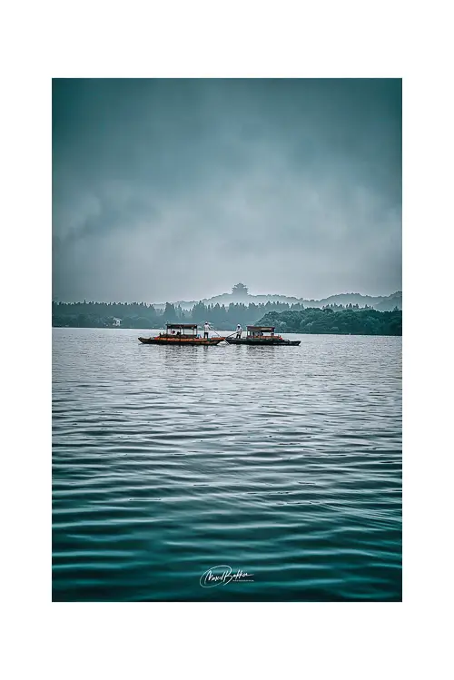 In the stillness of a mist-covered morning on West Lake, two wooden boats drift slowly across the water — neither rushing nor pausing, simply being. The fog wraps the scene in a quiet hush, softening the mountains and temples in the distance, as if nature itself is whispering a lullaby.